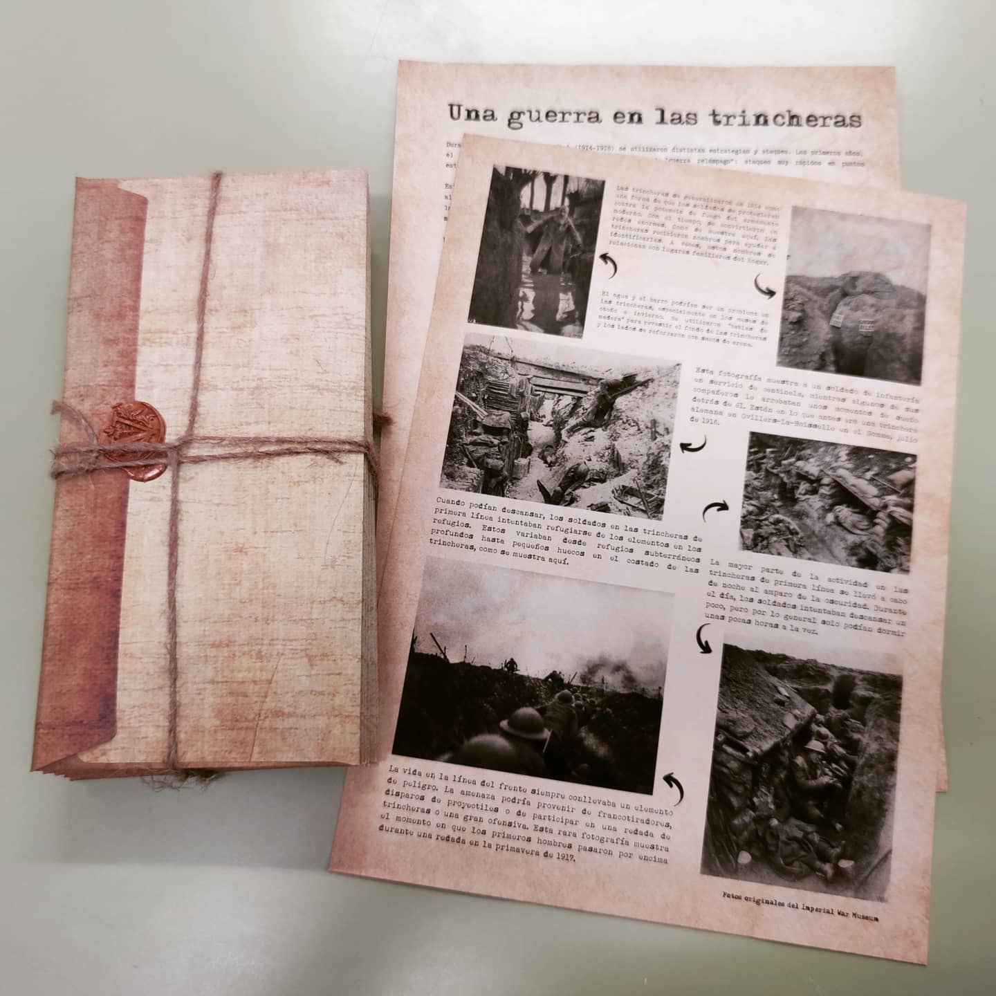 Durante la actividad, en diferentes momentos de las dos semanas de trabajo, a modo de misiones extra, el alumnado encontraba en el aula unos paquetes de cartas selladas con una información adicional y una actividad. De esta manera, mantenemos el interés por el juego y ampliamos los materiales de una forma diferente y lúdica. Las tres misiones tienen como contenido: la entrada de los EEUU en la Gran Guerra, la vida en las trincheras y los cambios que se dieron en las alianzas iniciales. En mi opinión, sigue siendo importantísima la estética para el juego y por ello reciben las cartas en papel envejecido, sobres lacrados y paquetes atados con cuerda.