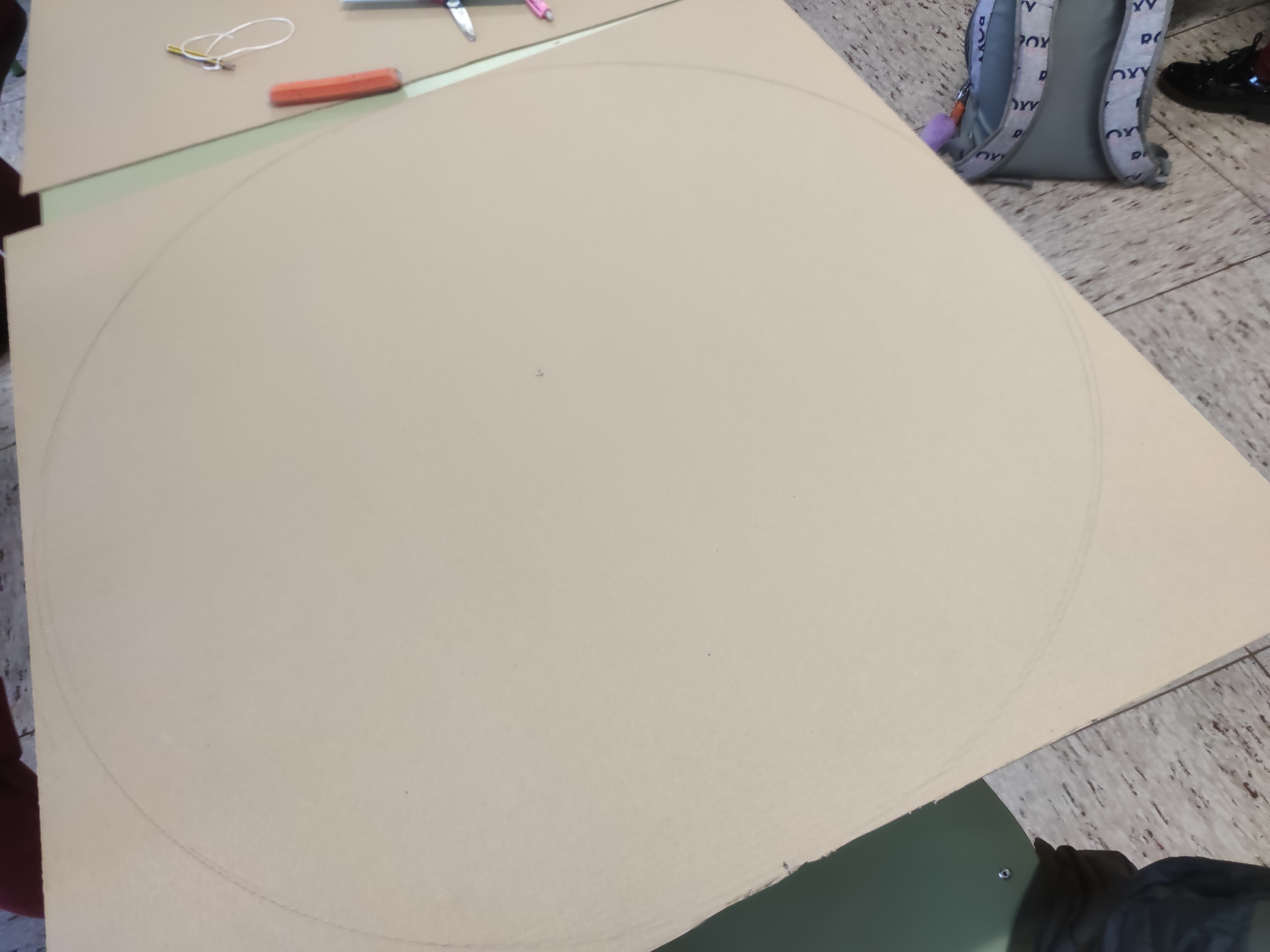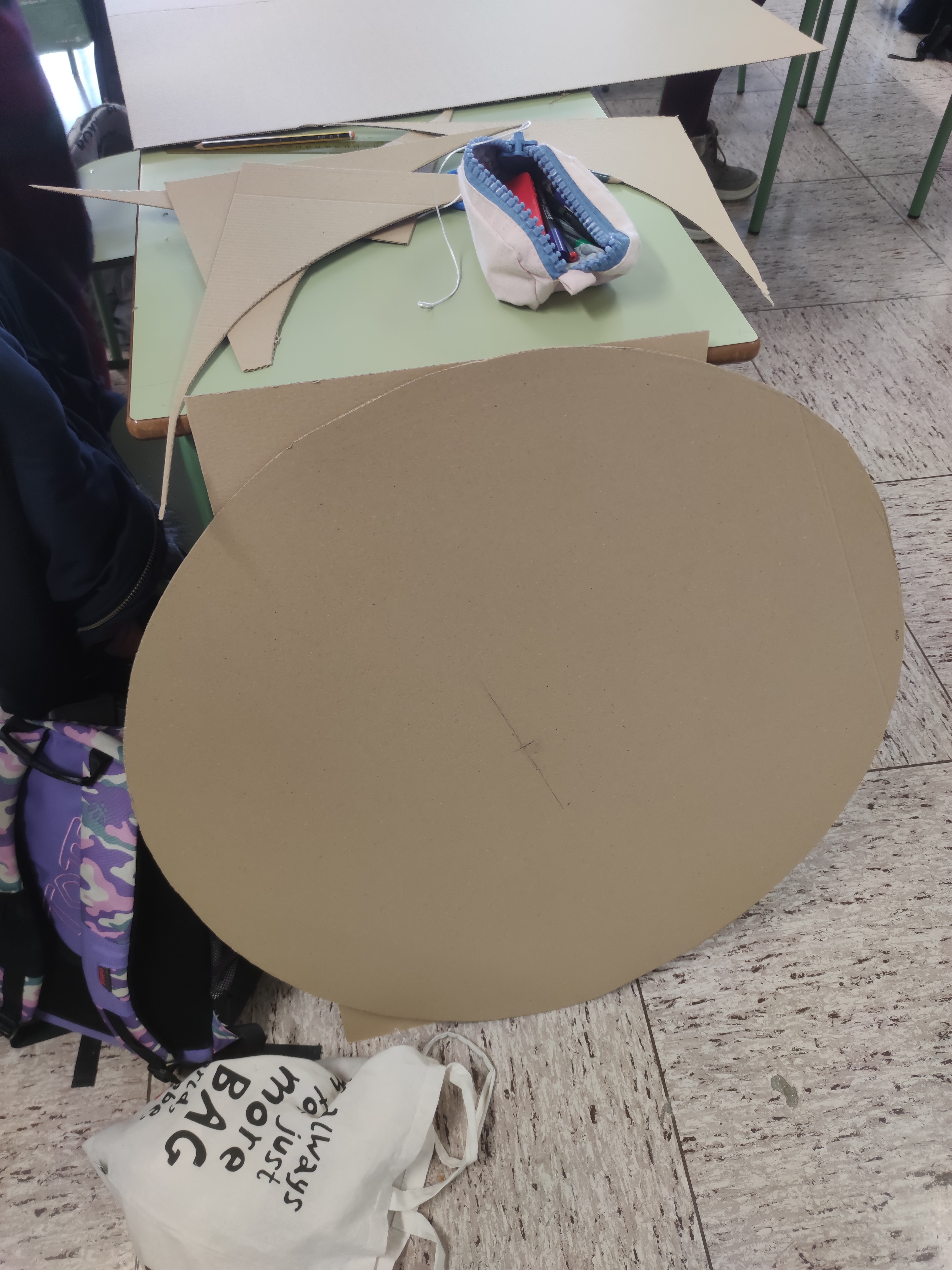 La primera parte es extraer un cuadrado de 80×80 cm de la plancha de cartón, el resto nos servirá para crear la agarradera del escudo. Posteriormente, con una cuerda y un lápiz, desde el centro del cartón se realiza un circunferencia de 80cm de diámetro. Esto se repite dos veces por escudo, y se pegan las dos planchas.