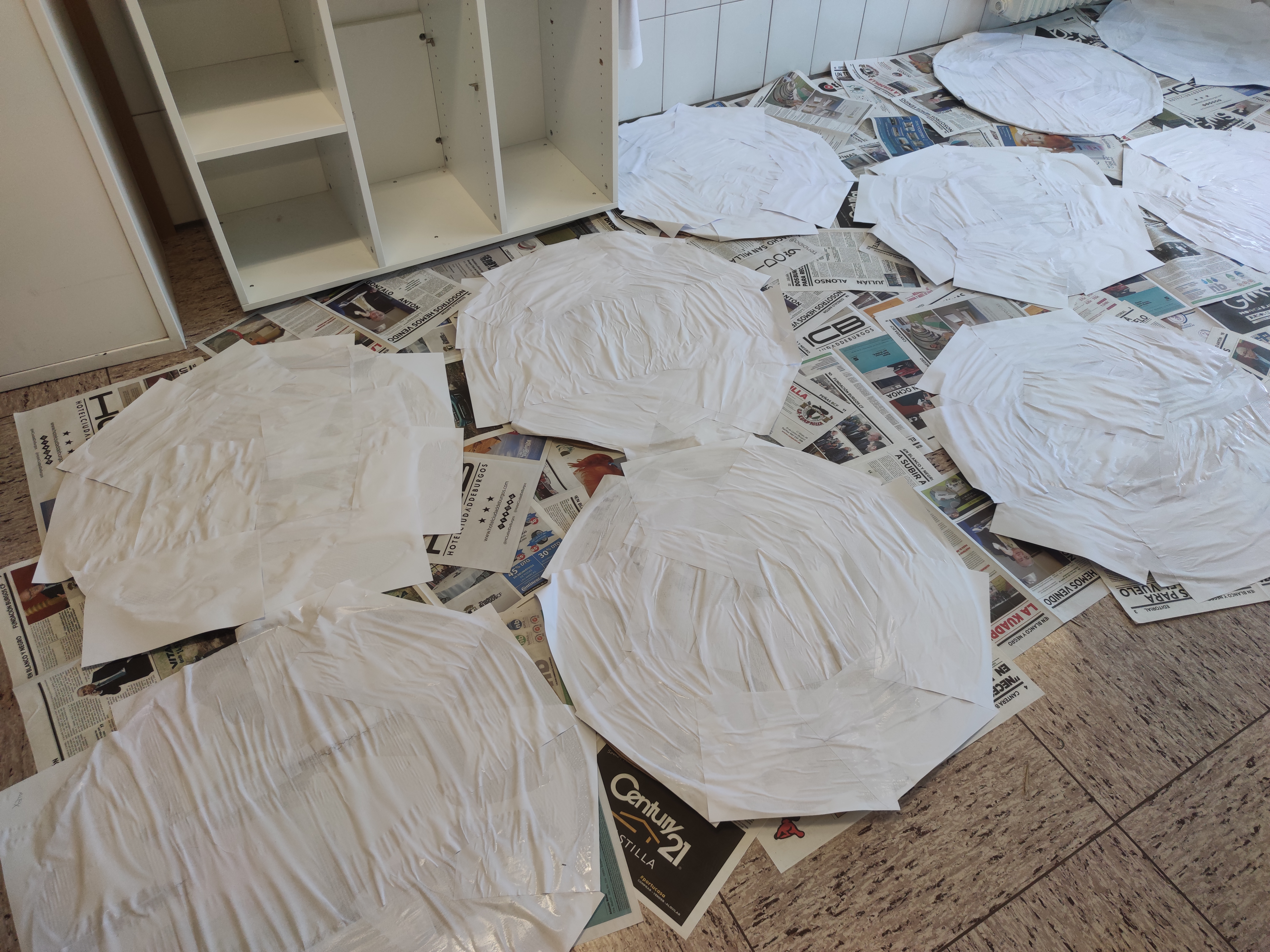 Posteriormente, con la mezcla de agua y cola, se van pegando todos los folios blanco en el cartón cubriendo toda su superficie. Se deja secar, en mi caso un fin de semana, y luego se recortan los sobrantes del escudo.