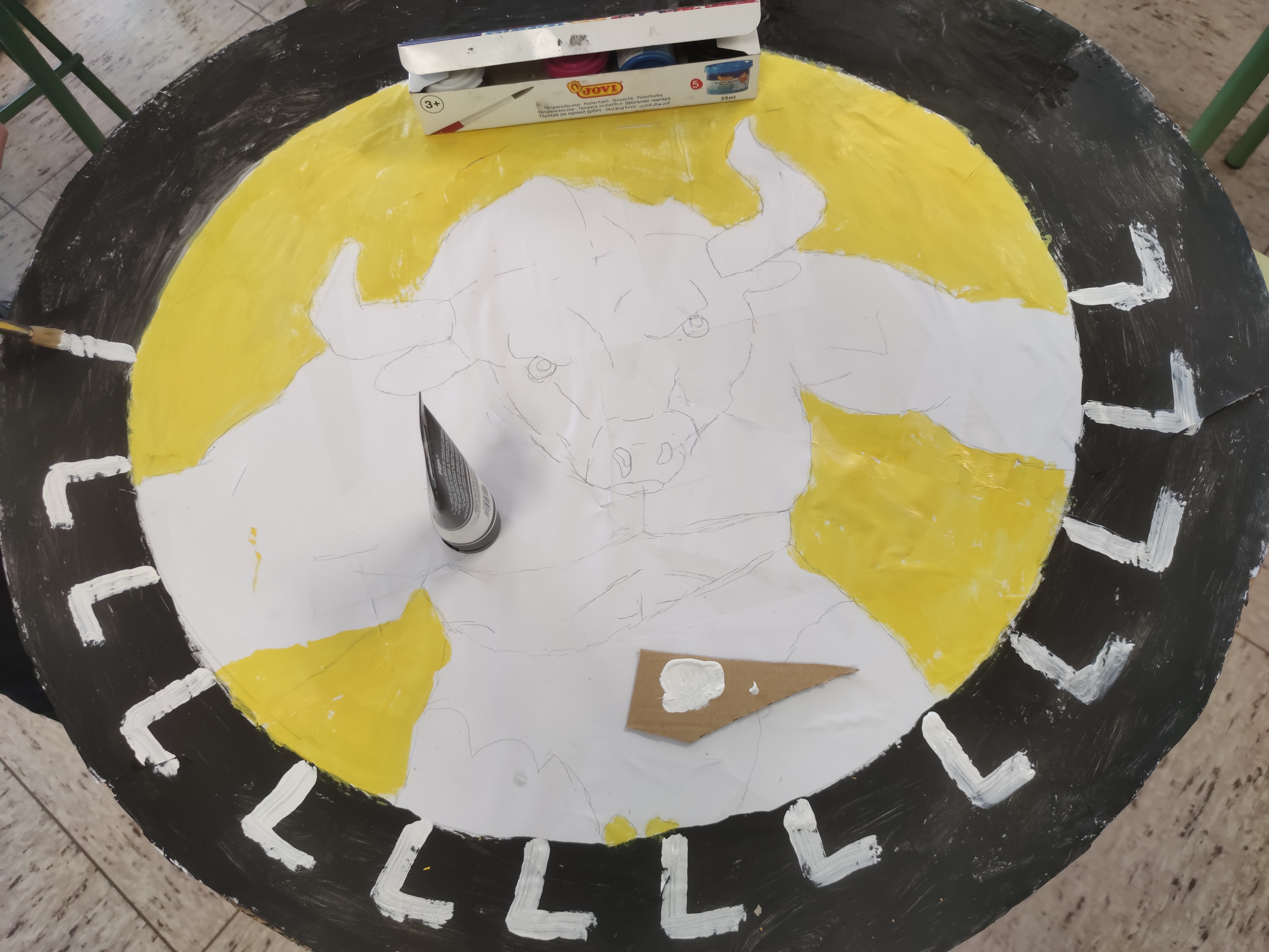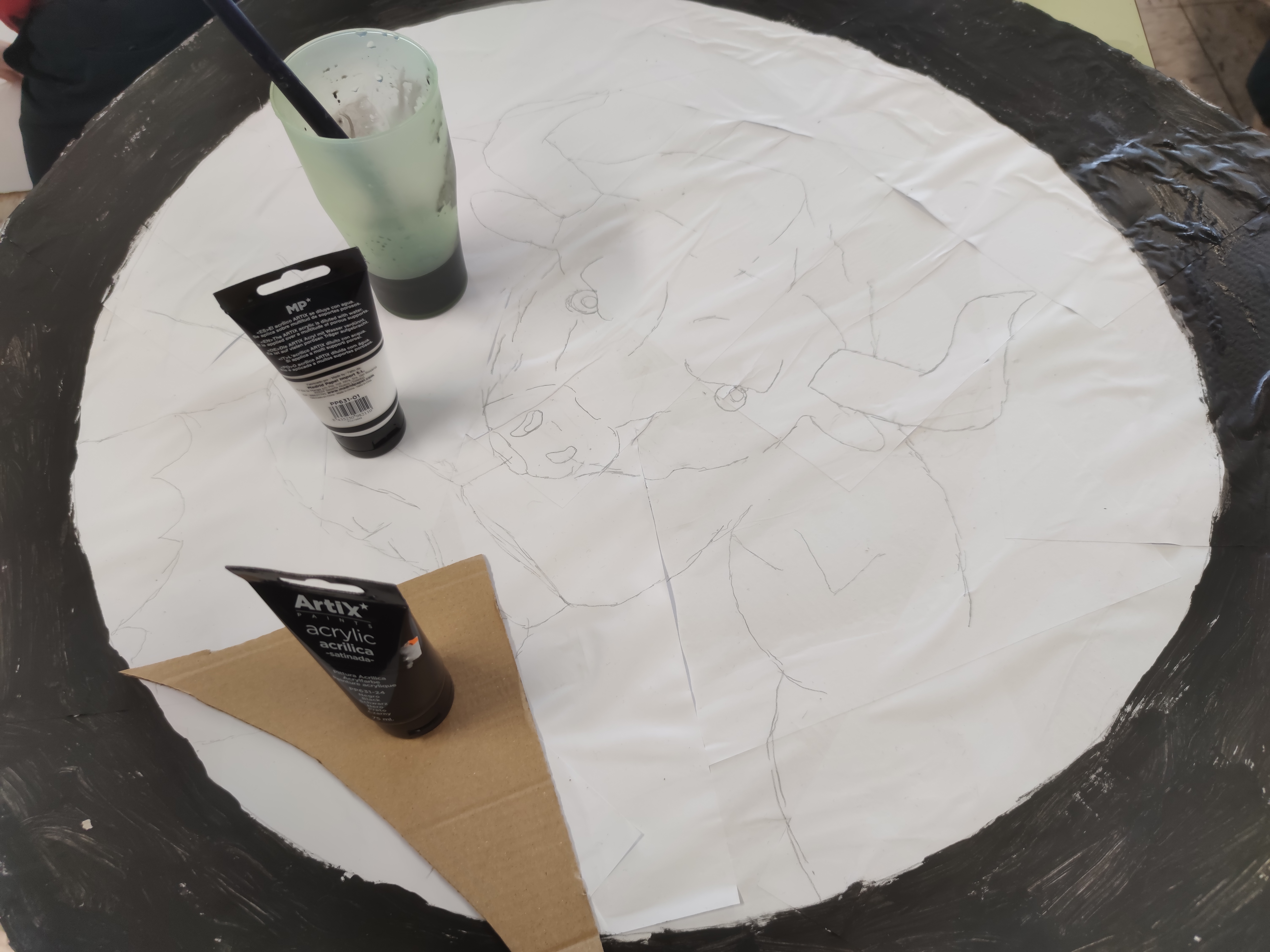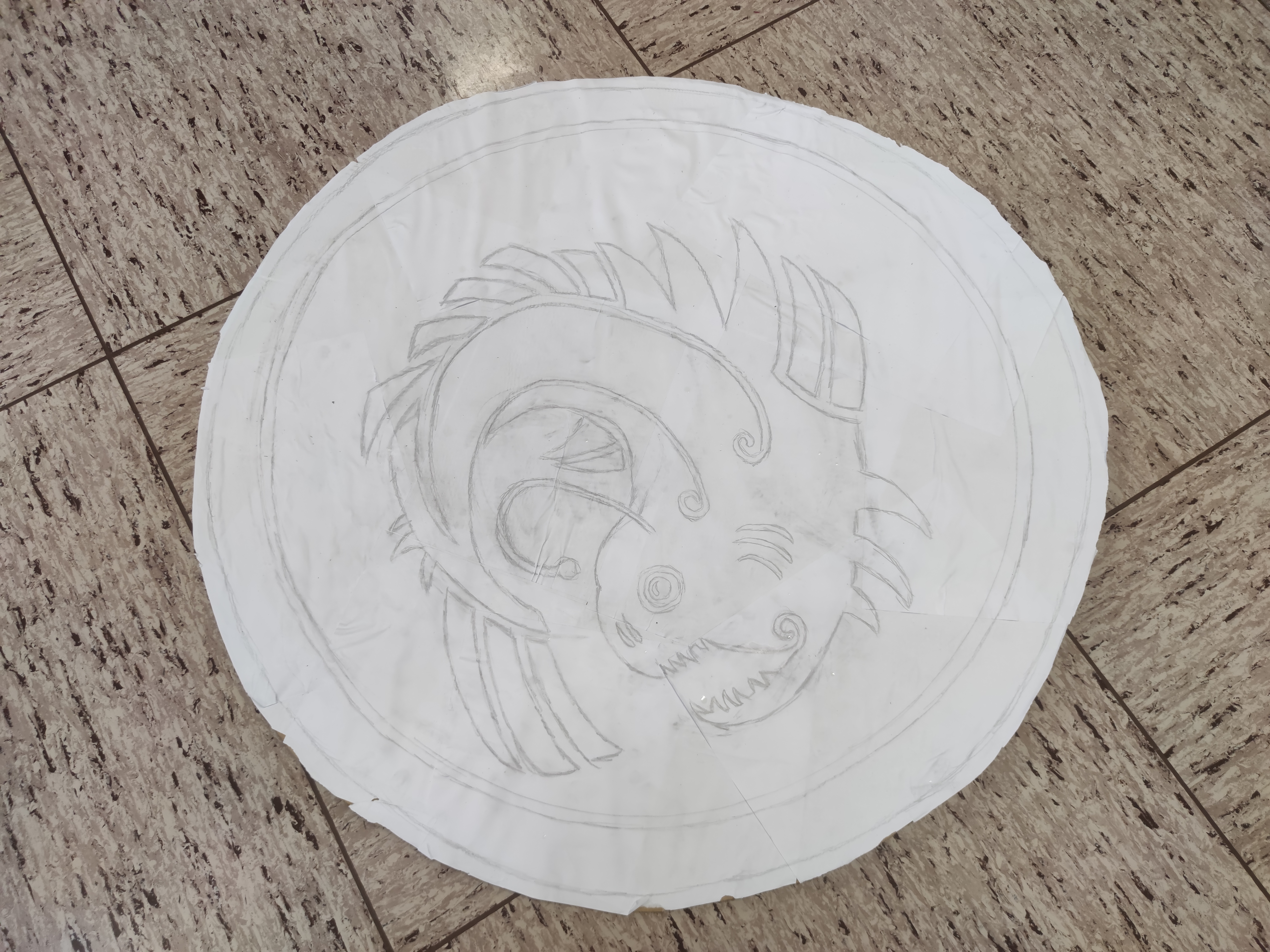 Tras dejarlo secar, se podrá comenzar a dibujar la figura que se quiera representar en el escudo, posteriormente se rotula y finalmente se pinta. Por último, se coloca la abrazadera en el reverso del escudo y se deja secar.