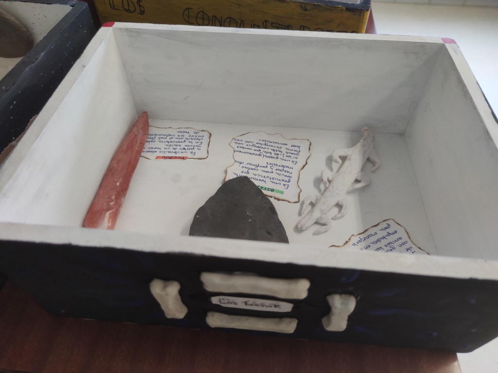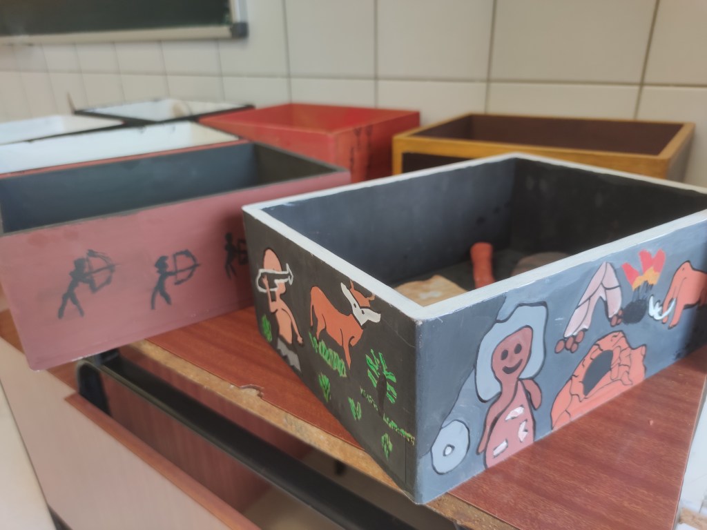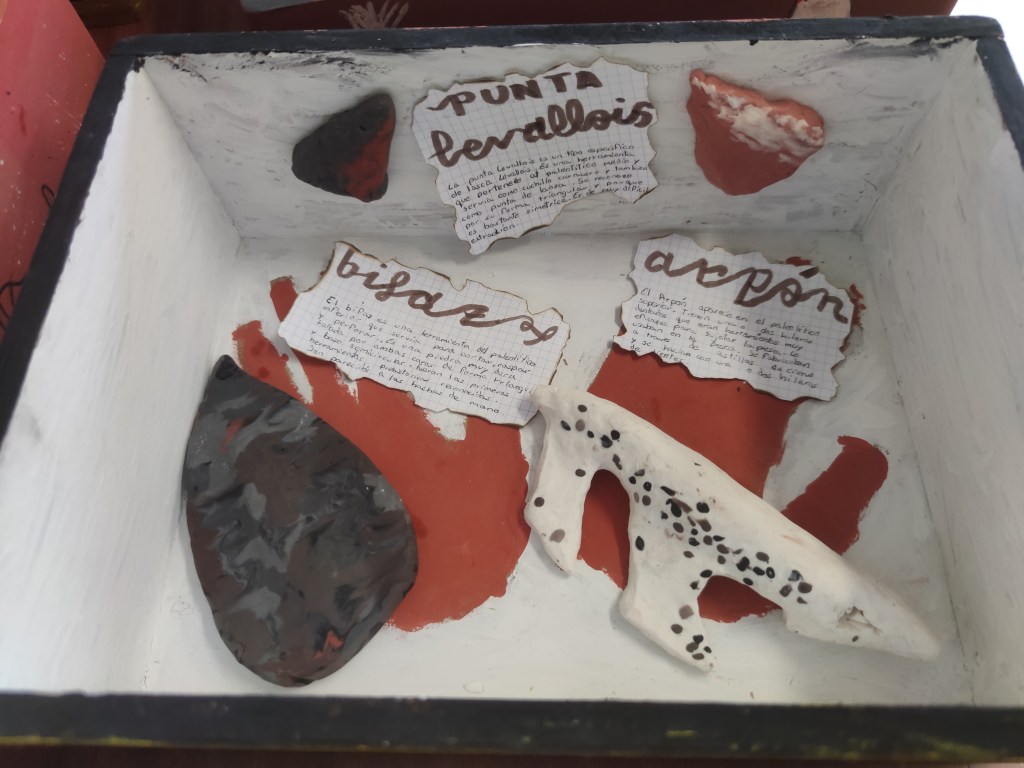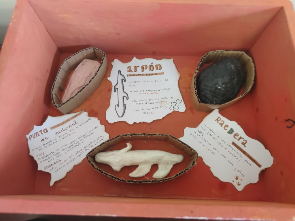 Aunque en mi caso la actividad se lleva a cabo dentro del proyecto interdisciplinar “Entre homínidos anda el juego” junto con las materias de Lengua Castellana y Educación Plástica. Se conjuga la habilidad manual, la creación de etiquetas y la representación e interpretación histórica para conseguir diferentes cajas de herramientas con varios útiles.