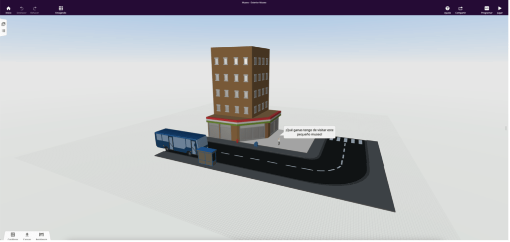 Comenzamos un pequeño recorrido de cómo organizar la actividad de creación de museos virtuales. En primer lugar, la etapa de diseño de la visita. En ella, los discentes deberán elegir su tipología de museo: de un único estilo, un recorrido por varios periodos estilos artísticos o un recorrido por obras del patrimonio más cercano a su localidad. Una vez elegido, comenzarán a estructurar el exterior del edificio (calle, vehículos, entrada, caminantes, mobiliario urbano, etc.), e irán avanzando sala a sala para conseguir crear su museo.
