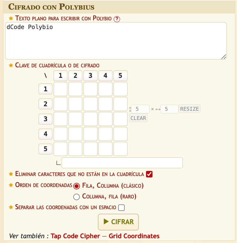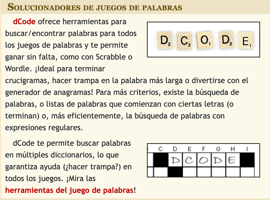 dCode es una colección extensa de herramientas para cifrar, descifrar y resolver una amplia gama de códigos y acertijos. Ofrece soluciones para sistemas clásicos como Morse, Polibio, César y Vigenère, así como para sistemas más complejos, o también imágenes con texto en diferentes colores que solo pueden ser vistos con gafas/lupas/plantillas de un color en especial.